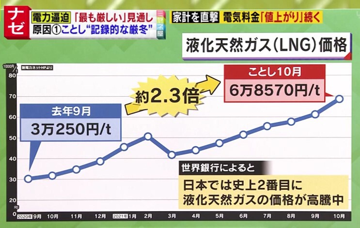 なぜ、ここまで電力不足となっているのか…理由は大きく分けて3つあります。一つ目の原因は、「厳冬の可能性が高く、電力需要が増」ということです。さらに、火力発電に使う液化天然ガス(LNG)の価格が高騰していることも原因とされています。2020年の9月では1トン当たり3万円ほどだった価格が、2021年10月には6万8570円と約2.3倍になっていて、世界銀行によると日本では史上2番目に液化天然ガスの価格が高騰しているということです。