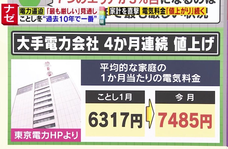 この電力のひっ迫を受け、大手電力会社は4カ月連続で値上げしており、東京電力によると、平均的な家庭の1か月あたりの電気料金は、2021年1月と12月を比べると「1168円」も値上がりしています。