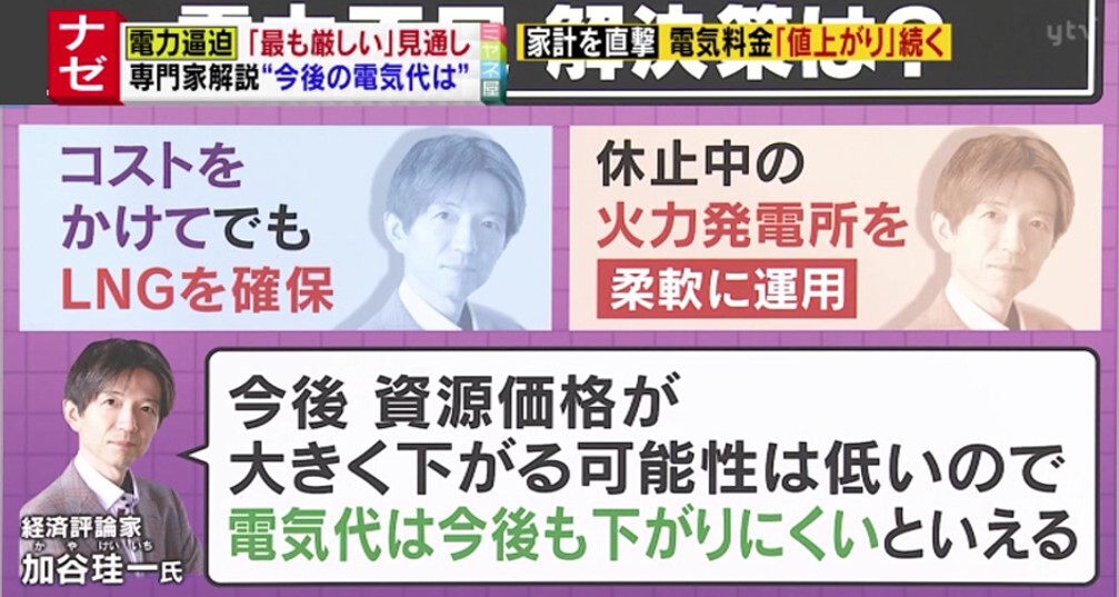 加谷さんによると、実は2020年も液化天然ガスの調達に苦労し、綱渡りのような状態だったということです。電力不足を解決するためには、コストをかけてでも液化天然ガスを確保すること、さらに、休止中の火力発電所を柔軟に運用することが必要だと言います。しかし、今後資源価格が大きく下がる可能性は低いので、電気代は今後も下がりにくいといえるといいます。