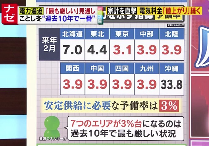 電力不足はエリアによって違いがあり、“電力供給の余力を示す指標”である「予備率」は、2022年2月で、北海道は7.0%、東北4.4%、東京3.1%、中部・北陸・関西・中国・四国・九州では3.9%、沖縄33.8%となっています。電力の安定供給に必要な「予備率」は3%とされており、資源エネルギー庁によると、7つのエリアが3%台になるのは過去10年で最も厳しい状況だということです。