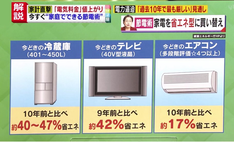 “家庭でできる節約術”三つ目は、「省エネ型の家電に買い替える」ことです。初期投資は必要ですが、昔の家電と比べると、今は格段に電力の消費効率が良いためです。