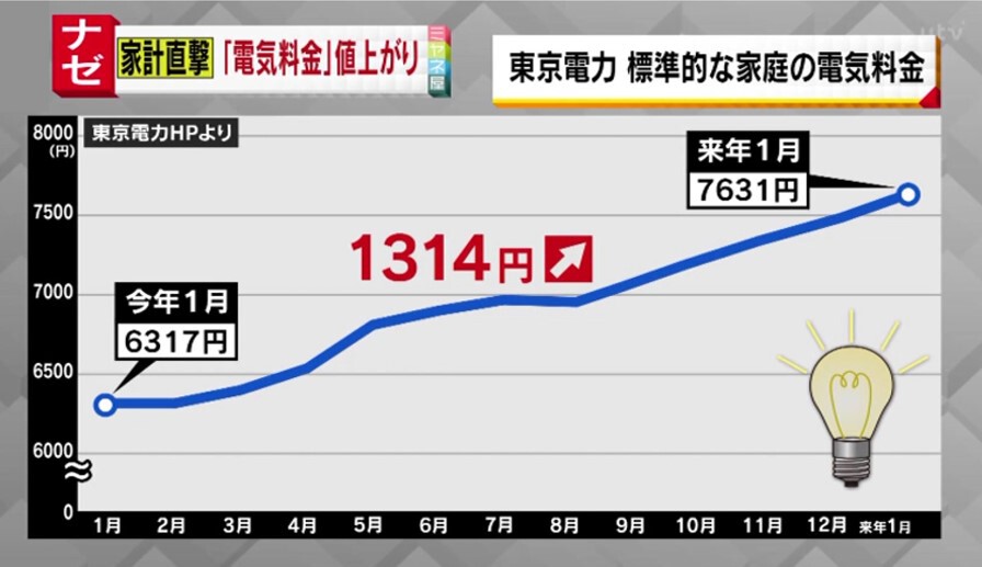 気が付けば、年々高くなっている電気料金。東京電力の標準的な家庭の電気料金を見てみると、2022年1月の電気料金は、1年前と比べ「1314円」の値上がりとなっています。さらに全国の電力会社10社でも、2022年1月に“値上げする”と発表しています。
