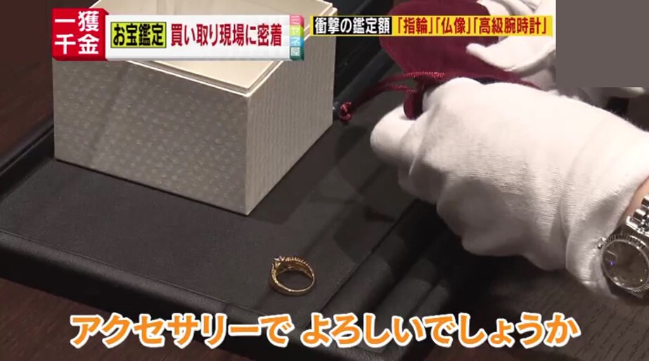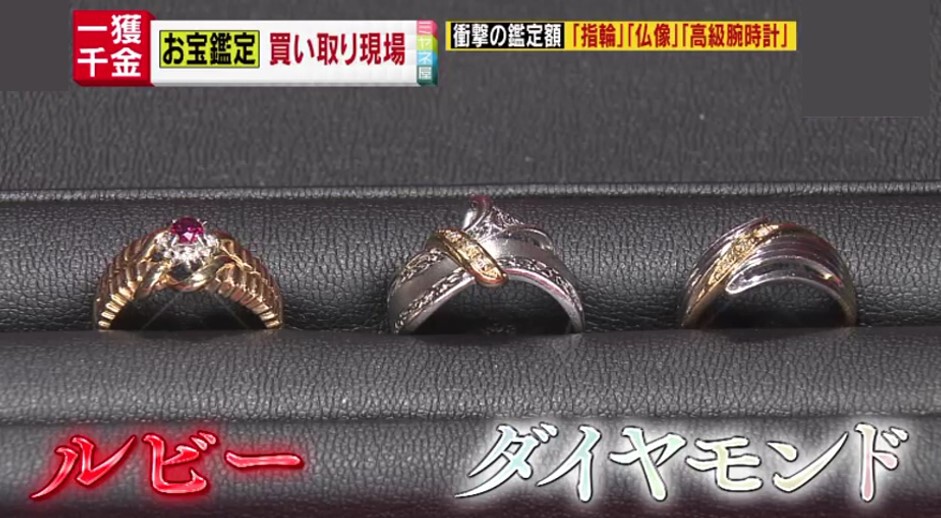 依頼者の女性が取り出した小さな袋の中から出てきたのは、金やプラチナのリングに、ルビーやダイヤが散りばめられた3つの指輪。20年ほど前に自分で購入したもので、3つ合わせて10万円ほどだったといいます。そして、もうひとつが…
