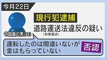 2025年4月22日には、道路運送法違反の疑いで中国籍の男が現行犯逮捕されました。男は、「運転したのは間違いないが、金はもらっていない」と否認しています。