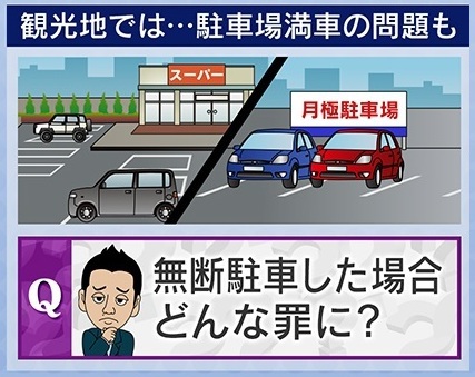 次に、観光地で駐車場が満車だった際の問題点を、法律的に見ていきます。まず、スーパーや月極駐車場などに無断駐車した場合、亀井弁護士は「形式的には、住居侵入や建造物侵入罪が考えられる」との見解を示しています。