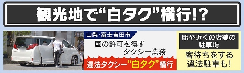 山梨・富士吉田市では、国の許可を得ずにタクシー業務を行う違法タクシー“白タク”が横行しています。駅や近くの店舗の駐車場には、客待ちする違法駐車も…。