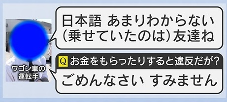現地で取材していた記者が別のワゴン車の運転手に直撃すると、「日本語、あまりわからない。乗せていたのは友達ね」と話し、「お金をもらったりすると違反だが?」との問いには、「ごめんなさい、すみません」と言いながら立ち去りました。