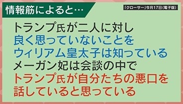 情報筋によると、「トランプ氏が二人に対し良く思っていないことを、ウィリアム皇太子は知っている。メーガン妃は、会談の中でトランプ氏が自分たちの悪口を話していると思っている」ということです。