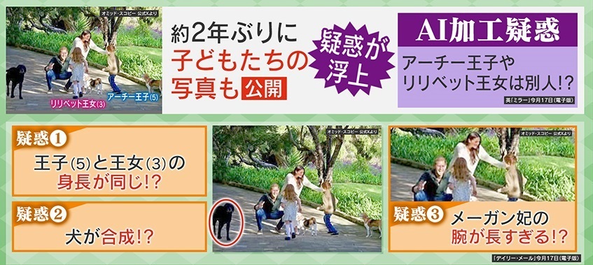 しかし、この写真を巡って今、2人の子どもの“影武者”疑惑が浮上しています。英『デイリー・メール』によると、その理由は5歳のアーチー王子と3歳のリリベット王女の身長が同じに見えることや、ペットとみられる犬が子どもたちを全く見ていないこと、そしてメーガン妃の腕が長すぎるように見えることです。英『ミラー』は、写真の子どもたちは全くの別人か、もしくはAIを使って捏造したものではないかという疑惑が持たれていると報じました。