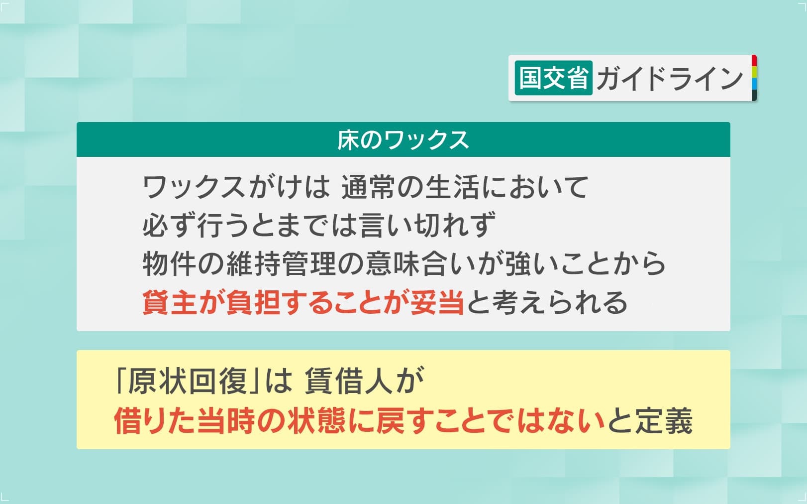 入居者が提出したという国交省のガイドラインには、「ワックスがけは通常の生活において必ず行うとまでは言い切れず、物件の維持管理の意味合いが強いことから、貸主が負担することが妥当と考えられる」と書かれていて、『原状回復』は、賃借人が借りた当時の状態に戻すことではないと定義されています。