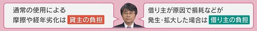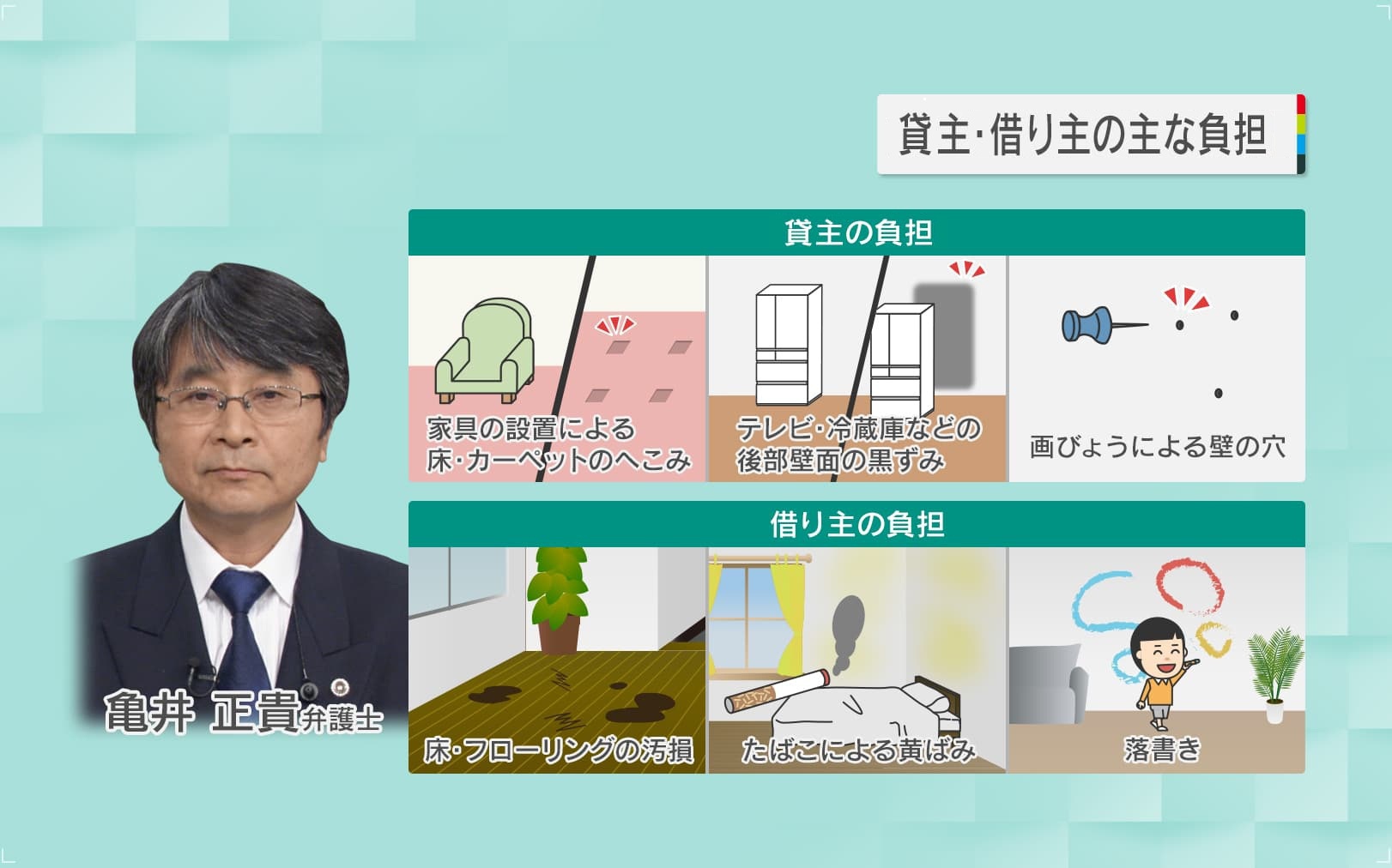 亀井正貴弁護士によると、「通常の使用による摩擦や経年劣化は貸した側の負担。借り主が原因で損耗などが発生、拡大した場合は借りた側の負担」ということです。
