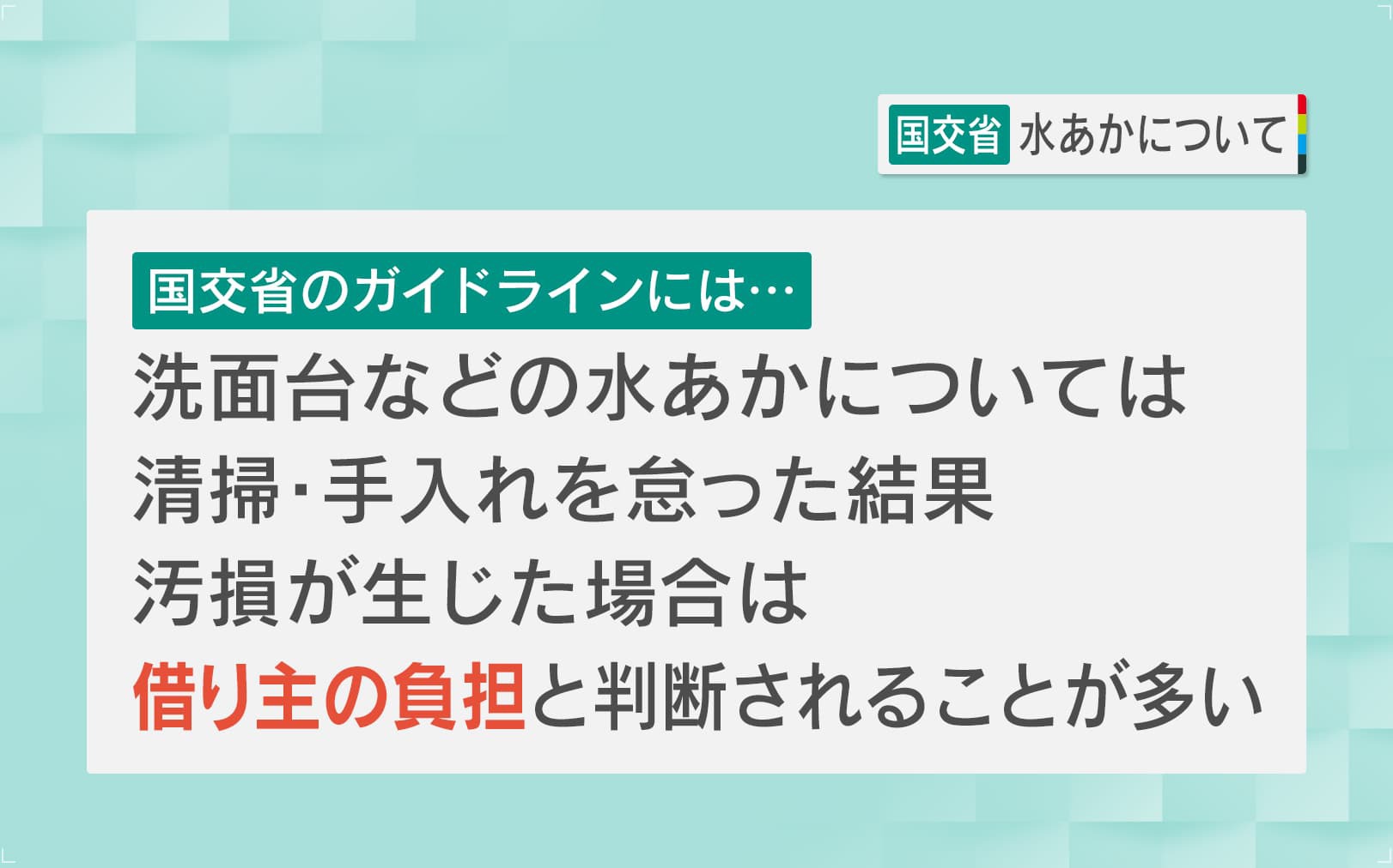 さらに、「洗面台などの水あかについては、清掃・手入れを怠った結果、汚損が生じた場合は、借り主の負担と判断されることが多い」ということです。