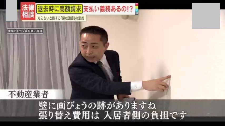 新居への引っ越しの前に、最後に行われるのが、不動産業者との『退去立ち会い』です。部屋の状態を確認し、原状回復にかかる費用を算出していきますが、不動産業者が「壁に画びょうの跡があり、張り替え費用は入居者側の負担です」と言い始めました。