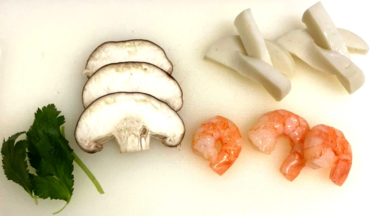 ③シイタケ、かまぼこ、エビ、みつばを適量切っておく(銀杏があれば銀杏も)