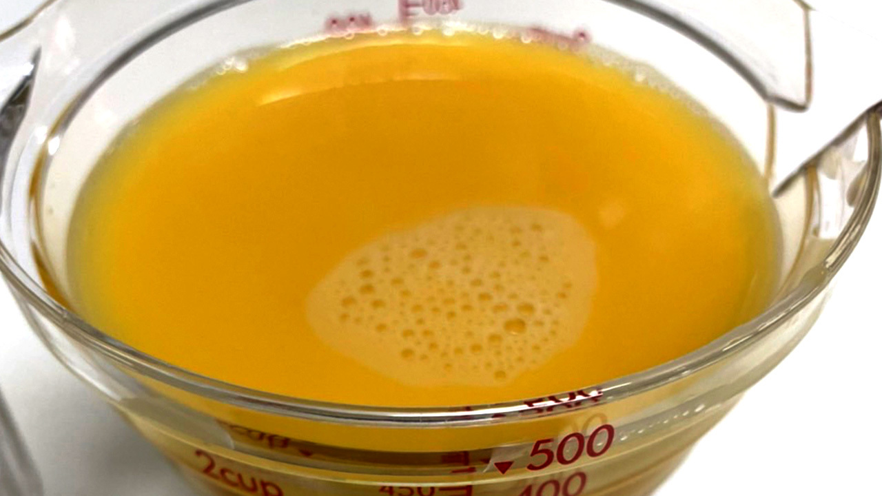 ①溶き卵と溶き卵の三倍程度の出汁と薄口醤油を混ぜて茶碗蒸しの卵液を作る