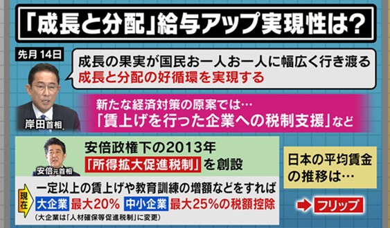 次に、岸田首相が掲げる「成長と分配」についてです。10月14日の記者会見で、岸田首相が「成長の果実が国民一人一人に幅広く行き渡る成長と分配の好循環を実現する」と発言し、「看護師・介護士・保育士の賃上げ」や「賃上げを行った企業への税制支援」を提言しました。