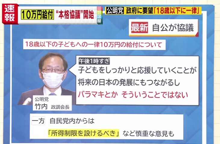 まずは、新たな給付金に関して。11月4日、公明党の北側一雄副代表が「経済的にお金が必要な時に現金で給付することが一番適切」と発言。公明党の公約は、対象を18歳以下の子ども一人当たり10万円相当の「未来応援給付」を所得制限なしでの実施を提案しています。