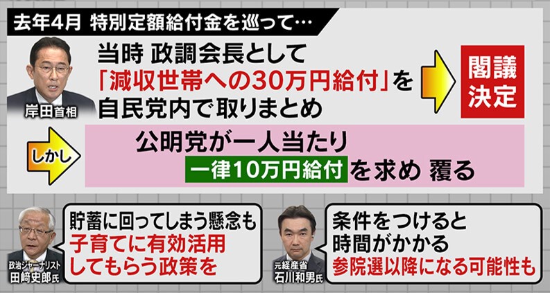 特別定額給付金を巡っては、2020年4月、当時政調会長だった岸田首相は「減収世帯への30万円給付」を取りまとめ閣議決定しました。しかし、公明党が一律10万円給付を求め、覆った経緯があります。