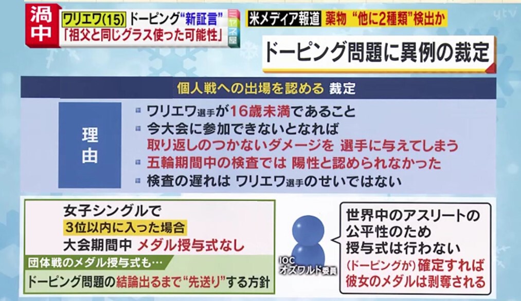 演技と共に気になるのが、ROCカミラ・ワリエワ選手の“ドーピング問題”です。ロイター通信によるとワリエワ選手側から「祖父と同じグラスを使った可能性がある」という新証言が出ている中、アメリカのニューヨーク・タイムズが「ワリエワ選手の検体からは禁止薬物を含め、3種類の薬物が検出されていた」と報じるなど、疑惑の闇は広がっています。CAS(スポーツ仲裁裁判所)が「暫定的に資格停止をしない」という裁定を出し、試合には出場していますが、問題に決着がついたわけではありません。