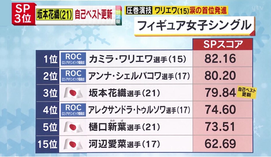 2月15日に行われた、北京オリンピック・フィギュアスケート女子ショートプログラム。ドーピング騒動の渦中にあるROC(ロシア・オリンピック委員会)カミラ・ワリエワ選手(15歳)が、82.16点という高得点をたたき出し、首位発進となりました。日本勢は、坂本花織(さかもと・かおり)選手(21歳) が自己ベストの得点で3位、トリプルアクセルを決めた樋口新葉(ひぐち・わかば)選手(21歳)が5位と、2月17日のフリープログラムに期待をふくらませる結果となりました。
