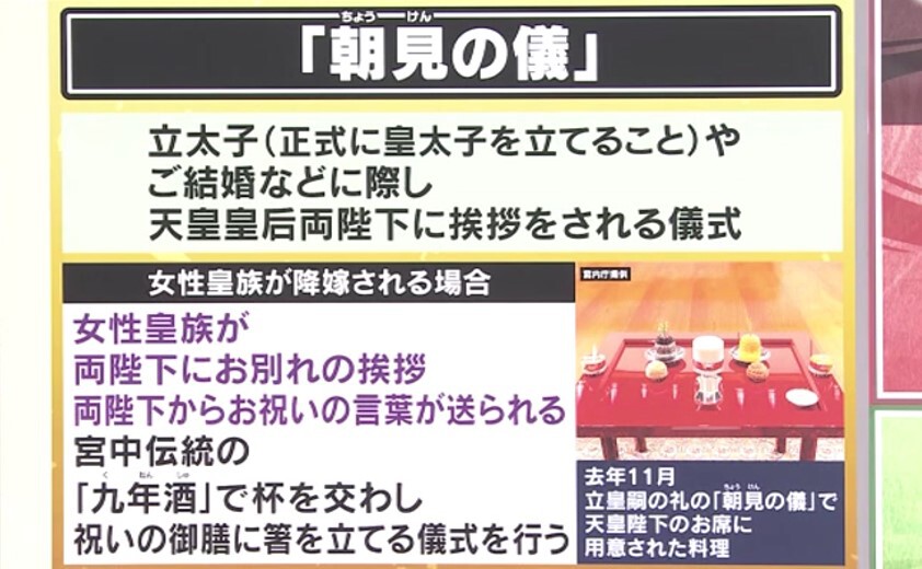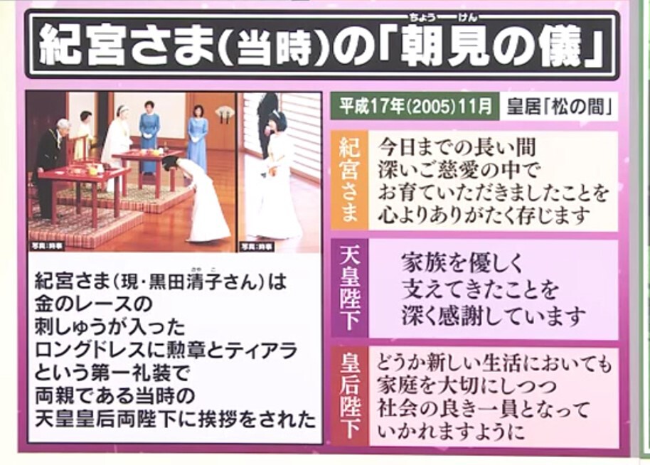 平成以降に結婚した3人の女性皇族について、2005年に結婚した上皇ご夫妻の長女・黒田清子(くろだ・さやこ)さんの場合は、「朝見の儀」は結婚式の3日前、皇居・宮殿の中で最も格式の高い「松の間」で行われました。