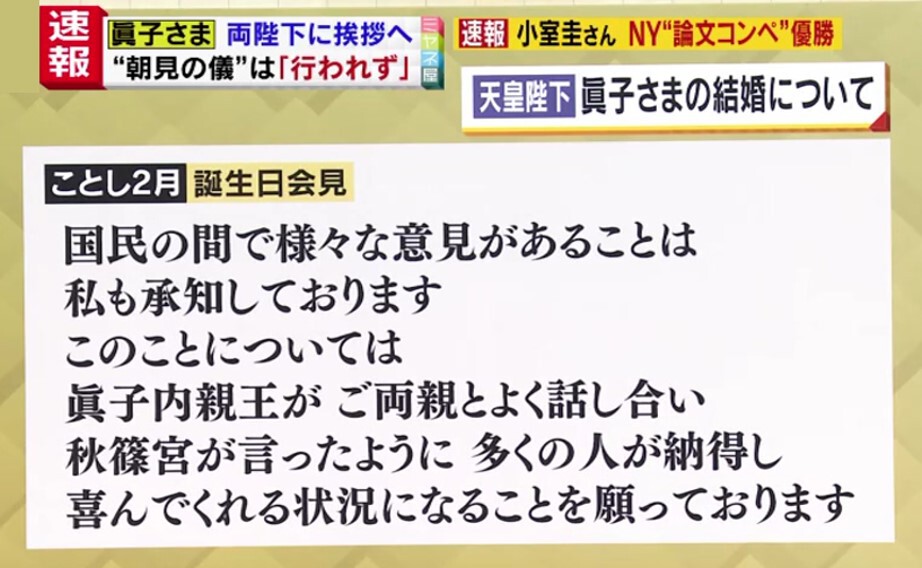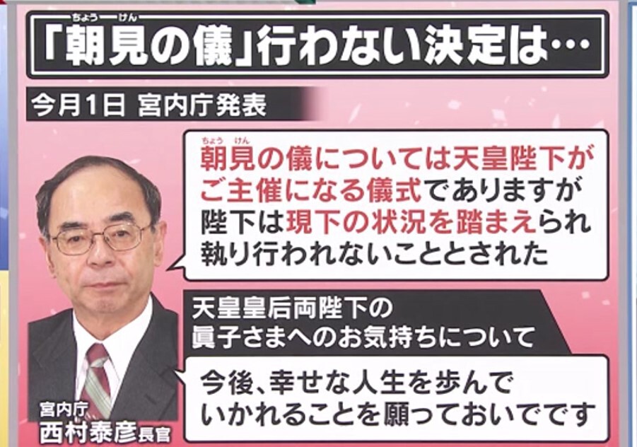 「朝見の儀」が行われないことについて、宮内庁の西村泰彦長官は「朝見の儀については、天皇陛下がご主催になる儀式でありますが、陛下は現下の状況を踏まえられ、執り行われないこととされた」と述べました。さらに天皇皇后両陛下の眞子さまへのお気持ちについて「今後、幸せな人生を歩んでいかれることを願っておいでです」としています。