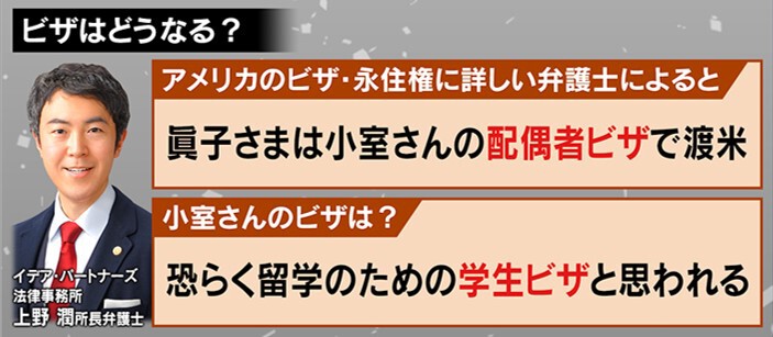 「小室さんの場合はすぐ取れると思います。既に就職しているわけだし。法律事務所も大きな法律事務所ですからそれなりの政治的な力があると思うんです。これ問題ないって思いますね、ビザは。」