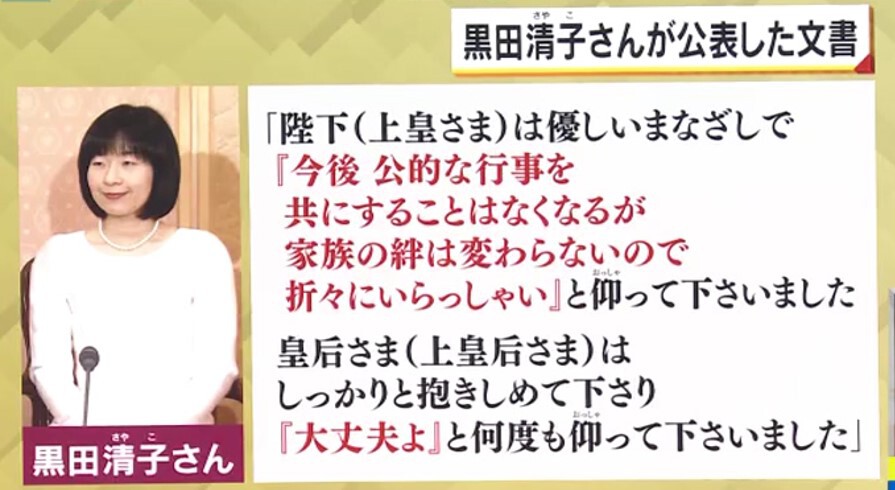 「陛下(上皇さま)は優しいまなざしで『今後、公的な行事を共にすることはなくなるが、家族の絆は変わらないので、折々にいらっしゃい』と仰って下さいました。皇后さま(上皇后さま)は、しっかりと抱きしめて下さり『大丈夫よ』と何度も仰って下さいました。」