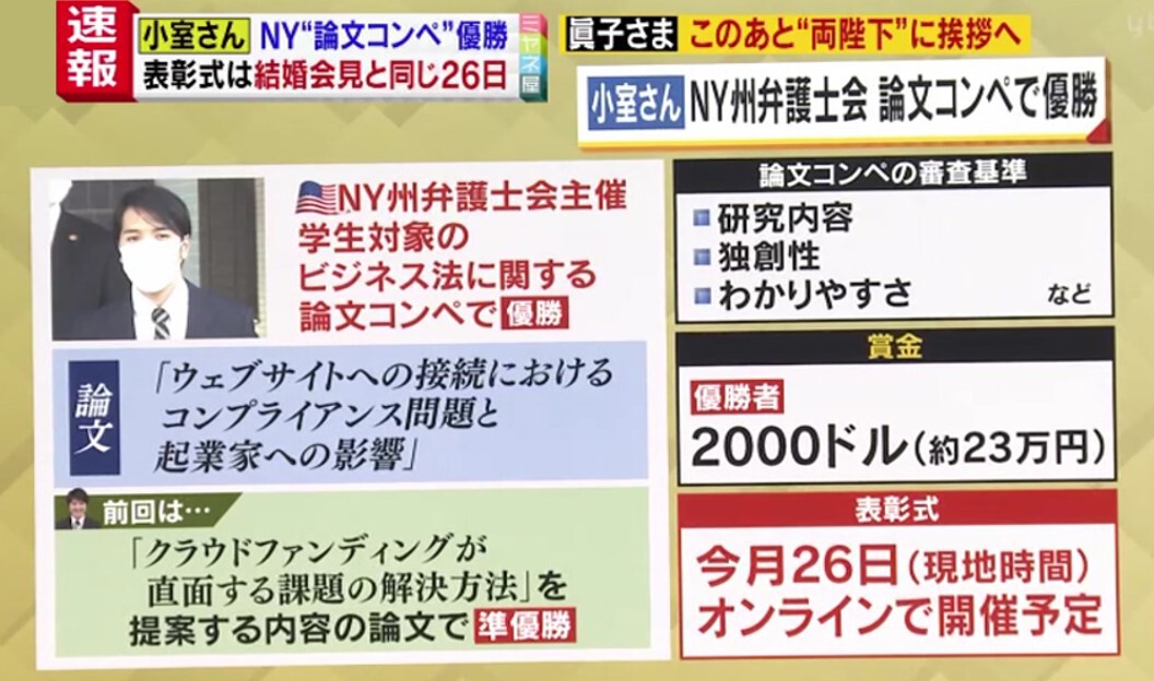 秋篠宮ご夫妻に結婚の挨拶をすませ、晴れの日まで秒読み段階に入った小室圭さんにもう一つ、おめでたいニュースが。ニューヨーク州弁護士会のホームページによると、学生を対象にしたビジネス法に関する論文コンペで、小室圭さんの論文が優勝したということです。