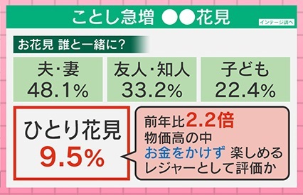 そんな中、2025年に急増したのが“ひとり花見”です。前年比2.2倍となり、物価高の中お金をかけずに楽しめるレジャーとして評価されたとみられています。