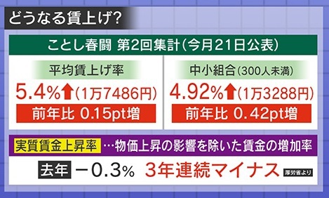一方、2025年の春闘・第2回集計(2025年3月21日公表)によると、平均賃上げ率は5.4%アップの1万7486円(前年比0.15pt増)、300人未満の中小組合でも4.92%アップの1万3288円(前年比0.42pt増)となっています。ただ、物価上昇の影響を除いた賃金の増加率を表す『実質賃金上昇率』は-0.3%(2024年)で、厚労省によると3年連続マイナスだということです。