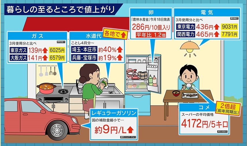 また、水道光熱費やガソリンなど、暮らしの至るところに値上げの波が。水道代は各地で値上げが相次いでいますが、埼玉・本庄市では約40%上がるということです。