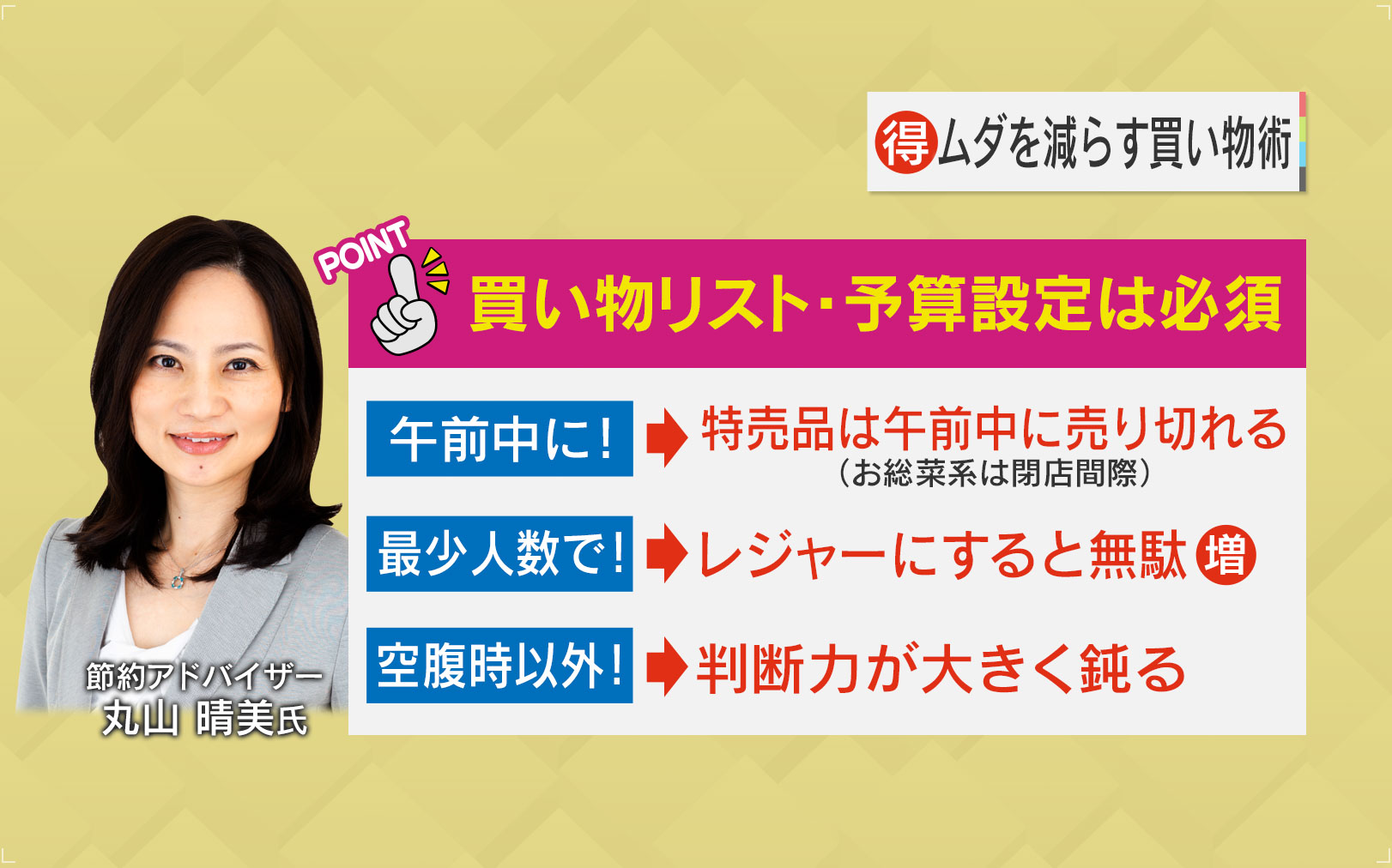 この物価高をどう乗り切ればいいのか、節約アドバイザー・丸山晴美氏に『ムダを減らす買い物術』を聞きました。丸山氏によると、買い物リスト・予算設定は必須。さらに、『①特売品は午前中に売り切れるため、買い物は午前中に(お総菜系は閉店間際)』『②買い物を“レジャー”にすると無駄が増えるため、最少人数で』『③判断力が大きく鈍るため、空腹時以外』の3箇条がポイントだということです。