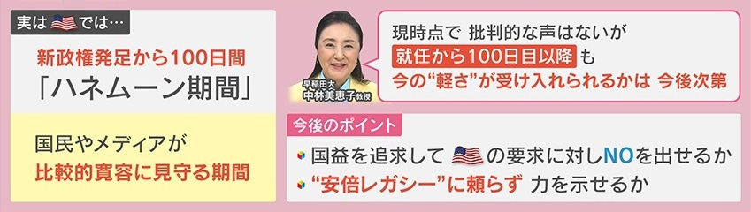 実は、アメリカでは新政権発足から100日間は『ハネムーン期間』と呼ばれていて、国民やメディアが比較的寛容に見守る期間があります。中林教授によると「現時点で批判的な声はないが、就任から100日目以降も今の軽さが受け入れられるかは、今後次第」ということです。今後の注目ポイントは、国益を追求して、アメリカの要求に対しノーを出せるか、“安倍レガシー”に頼らず、力を示せるかどうかだといいます。