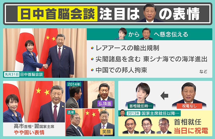 10月31日には、日中首脳会談が行われました。レアアースの輸出規制、尖閣諸島を含む東シナ海での海洋進出、中国での邦人拘束など、高市首相から懸念を伝えました。