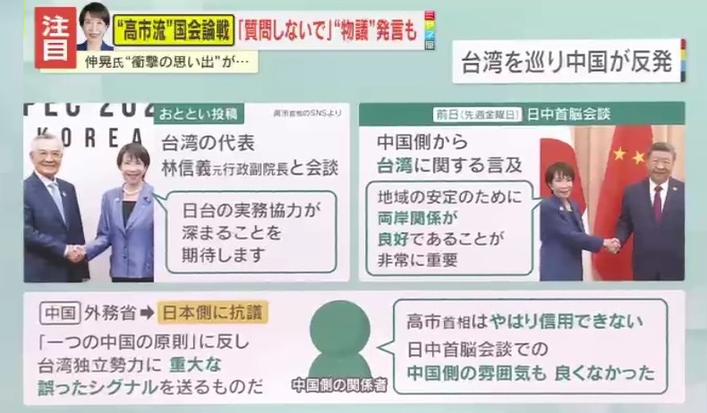 11月1日には、台湾の代表と会談をしました。高市首相は「日台の実務協力が深まることを期待します」と発言しました。しかしその前日、日中首脳会談の際には、中国側から台湾に関する言及があり、高市首相は「地域の安定のために両岸関係が良好であることが非常に重要」と話していました。