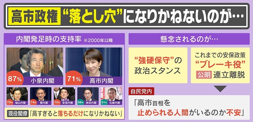 高市内閣発足時の支持率は71%で、現役閣僚からは「高すぎると落ちるだけになりかねない」との声が上がっています。さらに懸念されているのが、強硬保守の政治スタンス・これまでの安保政策のブレーキ役であった公明党の連立離脱で、自民党内からは、「高市首相を止められる人間がいるのか不安」という声も上がっています。