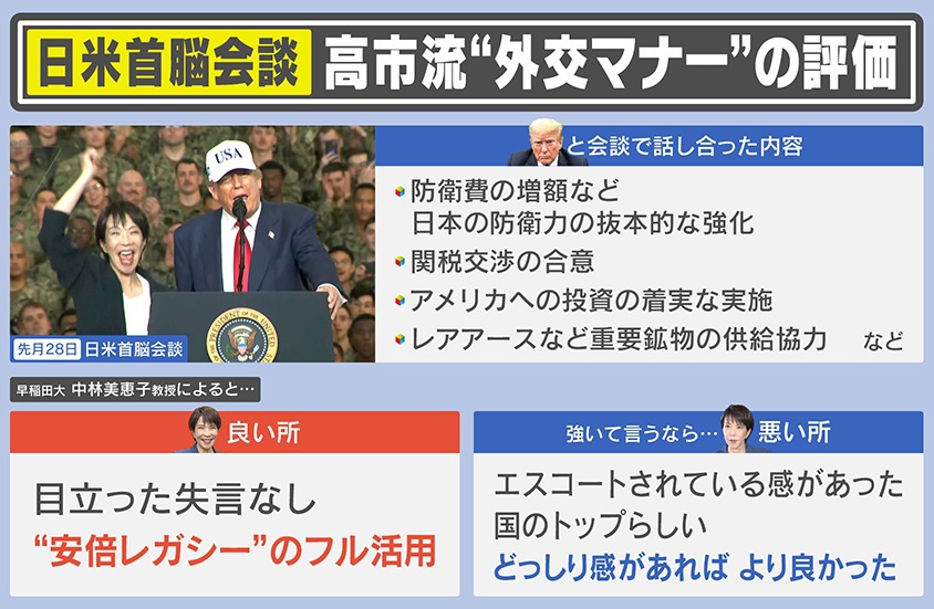 高市首相の外交マナーについて、早稲田大学・中林美恵子教授によると、「良かったところは、目立った失言がなく、“安倍レガシー”をフル活用していたこと。悪かった所は、強いて言うなら、エスコートされている感じがあった。国のトップらしいどっしり感があれば、より良かった」ということです。