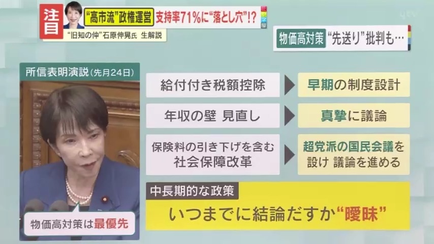 物価高対策については、まだ決まっていないことも多く、『給付付き税額控除』は“早期の制度設計”、『年収の壁見直し』は“真摯に議論”、『社会保障改革』も“超党派の国民会議を設け、議論を進める”ということで、いつまでに結論を出すかは“曖昧”となっています。