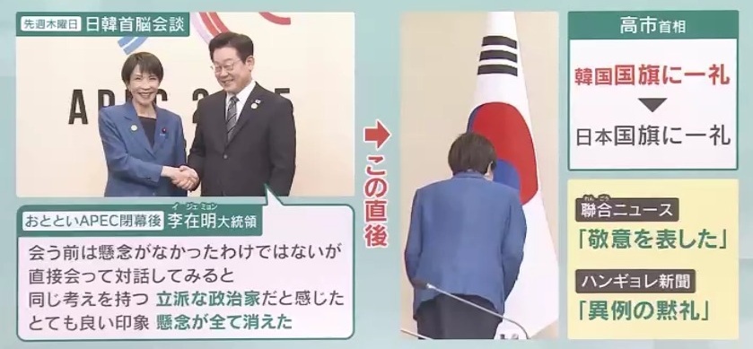 日韓首脳会談では高市首相は韓国国旗に一礼し、日本国旗に一礼しました。この行動に『聯合ニュース』は、「敬意を表した」、『ハンギョレ新聞』も「異例の黙礼」と報道しました。