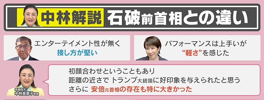 石破前首相との対応の違いについて、中林教授は「石破前首相が、エンターテイメント性がなく接し方が堅かったのに対し、高市首相は、パフォーマンスは上手いが“軽さ”を感じた。初顔合わせということもあり、距離の近さでトランプ大統領に好印象を与えられたと思う。さらに、安倍元首相の存在も特に大きかった」と分析しています。