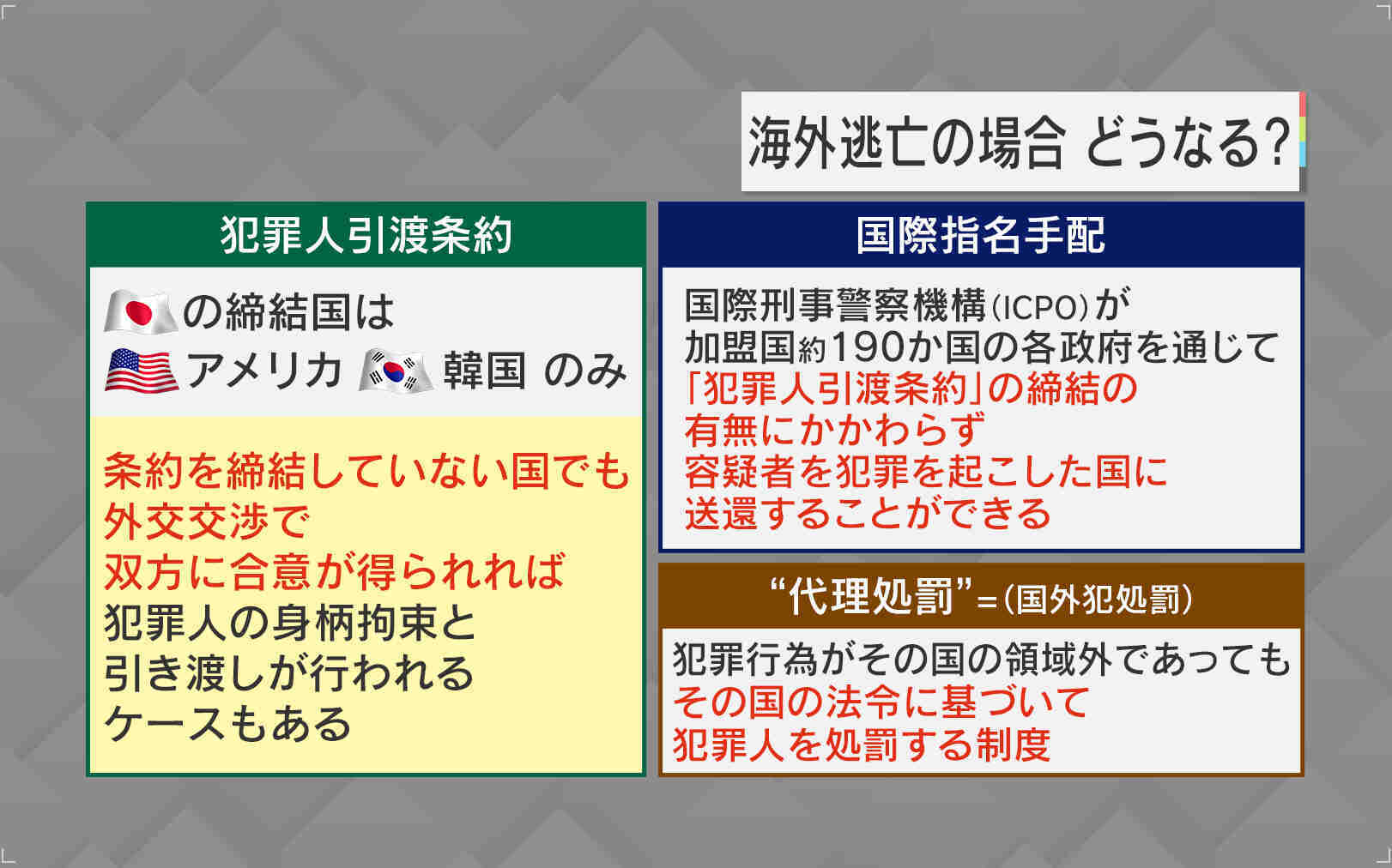 今回の谷口光弘容疑者のように、海外に逃亡した場合はどうなるのでしょうか。その国と「犯罪人引渡条約」という条約を交わしている場合は、犯罪人の引き渡しが可能になります。ただ、日本の締結国はアメリカと韓国のみです。一方で、条約を締結していない国でも、外交交渉で双方に合意が得られれば、犯罪人の身柄拘束と引き渡しが行われるケースもあるといいます。また、今後谷口光弘容疑者が「国際指名手配」になれば、国際刑事警察機構(ICPO)が加盟国の各政府を通じて、「犯罪人引渡条約」の締結の有無にかかわらず、容疑者を犯罪を起こした国に送還することができます。さらに、「代理処罰」(国外犯処罰)というものもあり、容疑者が逃げ込んだ国の法令に基づいて犯罪人を処罰してもらう制度もあるということです。