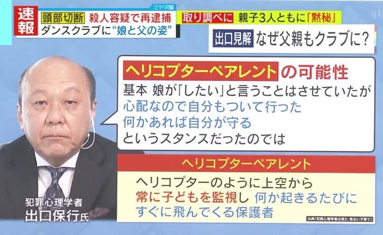 “ヘリコプターペアレント”とは、「ヘリコプターのように上空から常に子どもを監視し、何か起きるたびに、すぐに飛んでくる保護者」のことで、出口氏は、「基本、娘がしたいということはさせていたが、心配なので自分もついていった。何かあれば自分が守る、というスタンスだったのでは」と分析しています。