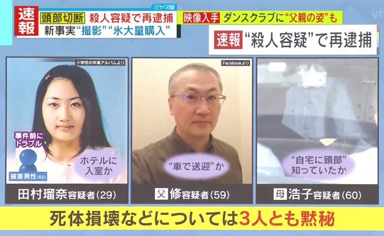 8月14日、警察は田村瑠奈容疑者、父・修容疑者、母・浩子容疑者の親子3人を殺人容疑で再逮捕しましたが、死体損壊などの容疑について、親子3人ともに黙秘していることが分かりました。