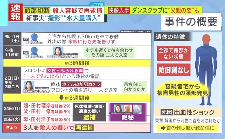 「札幌・すすきの」のホテルで首を切断された男性の遺体が見つかった事件。警察は14日、殺人の疑いで親子3人を再逮捕しました。親子3人は事件について黙秘していること、そして瑠奈容疑者と被害男性が親密そうな様子だったダンスクラブに修容疑者もいたことが、新たに分かりました。元検事の弁護士・亀井正貴氏、犯罪心理学者・出口保行氏のダブル解説です。