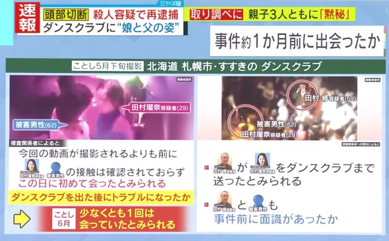 瑠奈容疑者と被害男性が“初めて会った”とされる映像を入手しました。映像が撮影されたのは2023年5月下旬、北海道札幌市・すすきのの「ダンスクラブ」です。捜査関係者によると、今回の動画が撮影されるよりも前に田村瑠奈容疑者と被害男性の接触は確認されておらず、初めて会ったとみられています。2人は非常に親密そうに抱き合う様子なども映っていましたが、一緒にダンスクラブを出た後、トラブルになったとみられています。しかし、瑠奈容疑者と被害男性は6月にも、少なくとも1回は会っていたとみられています。