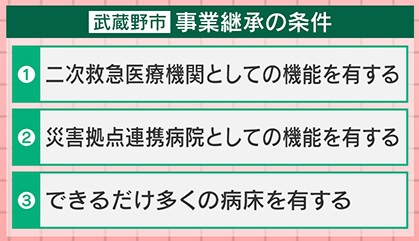そんな中、新たな動きが。別の団体が事業を継承し、受け継ぐ話が持ち上がりました。武蔵野市が出した事業継承の条件は、『①二次救急医療機関としての機能を有する』『②災害拠点連携病院としての機能を有する』『③できるだけ多くの病床を有する』でしたが、2025年3月5日、東京都内の病院を経営する法人が継承すると発表しました。
