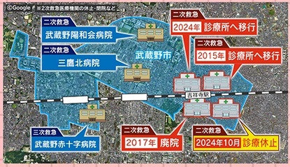 吉祥寺駅周辺では、2015年9月に『松井外科病院(91床)』が廃院し、診療所に。2年後の2017年9月、『水口病院(43床)』が廃院。2024年4月には『森本病院(74床)』が廃院して診療所へ移行し、地域で24時間受け入れ可能な病院は『吉祥寺南病院(125床)』だけとなっていました。