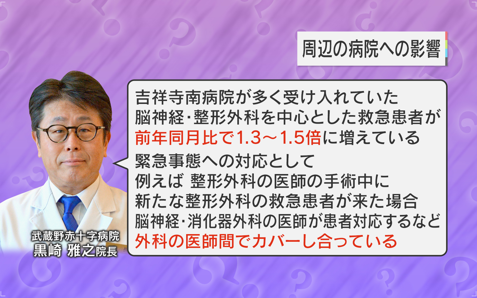 ただ、周辺の病院への影響について、三次救急である武蔵野赤十字病院の黒崎雅之院長は、「吉祥寺南病院が多く受け入れていた脳神経・整形外科を中心とした救急患者が、前年同月比で1.3~1.5倍に増えている。緊急事態への対応として、例えば、整形外科の医師の手術中に新たな整形外科の救急患者が来た場合、脳神経・消化器外科の医師が患者対応するなど、外科の医師間でカバーし合っている」と話しています。