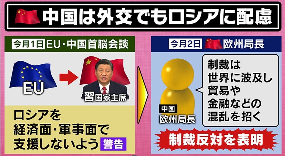 2022年4月1日、中国とEUの首脳会談が行われましたが、この中でEUは習近平国家主席に対して、ロシアを経済面・軍事面で支援しないよう“警告”を出しています。しかしその翌日、中国のヨーロッパ局長は「ロシアへの金融制裁は、世界に波及し貿易や金融の混乱を招く」として、これに反対を表明しています。